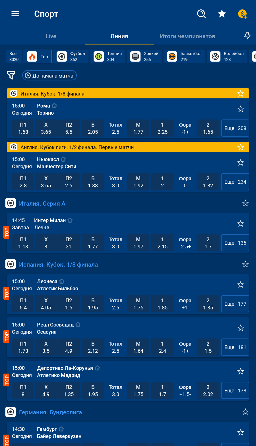 - Избранное - добавление команд, лиг и матчей в "Избранное" для быстрого доступа к ставкам по ним.