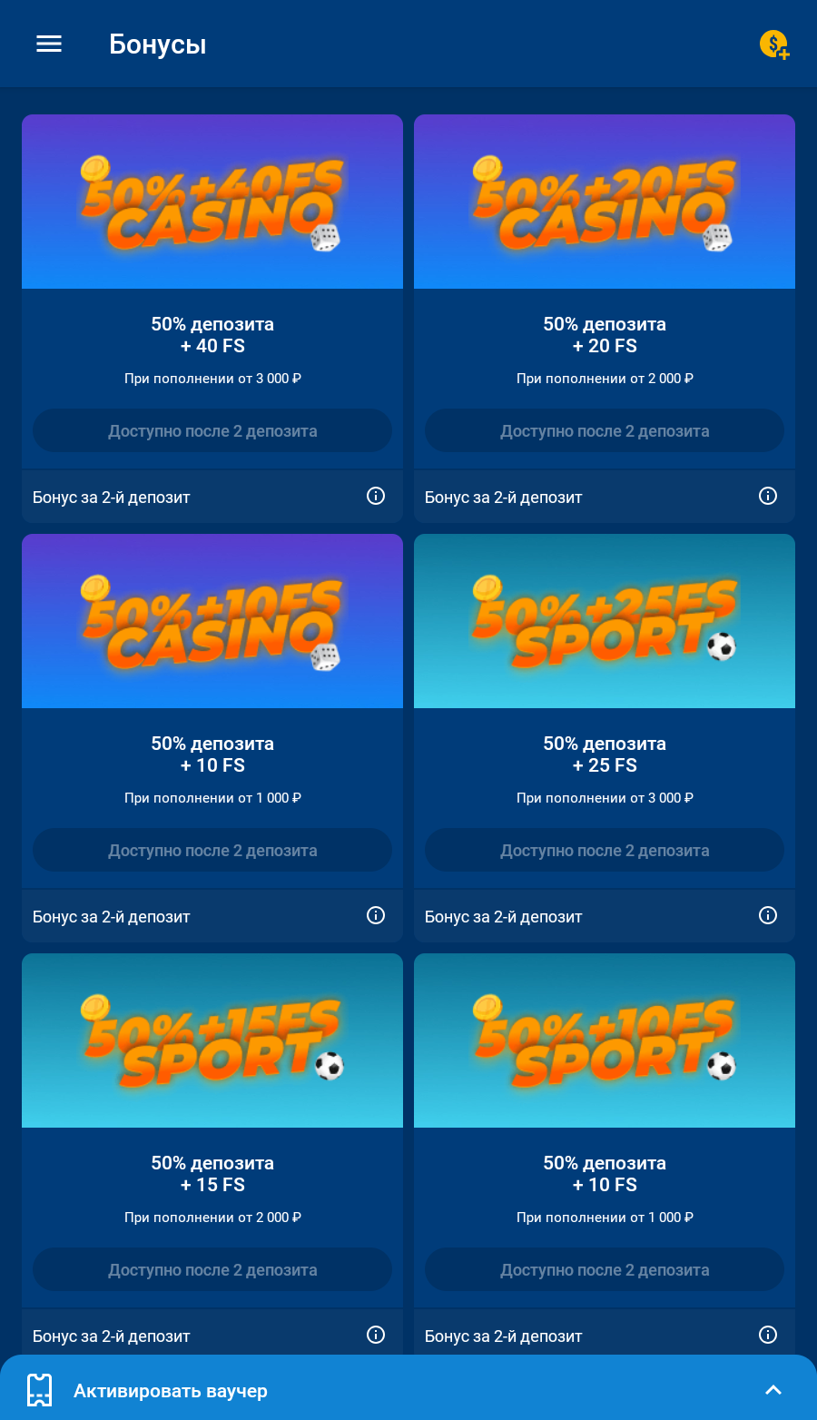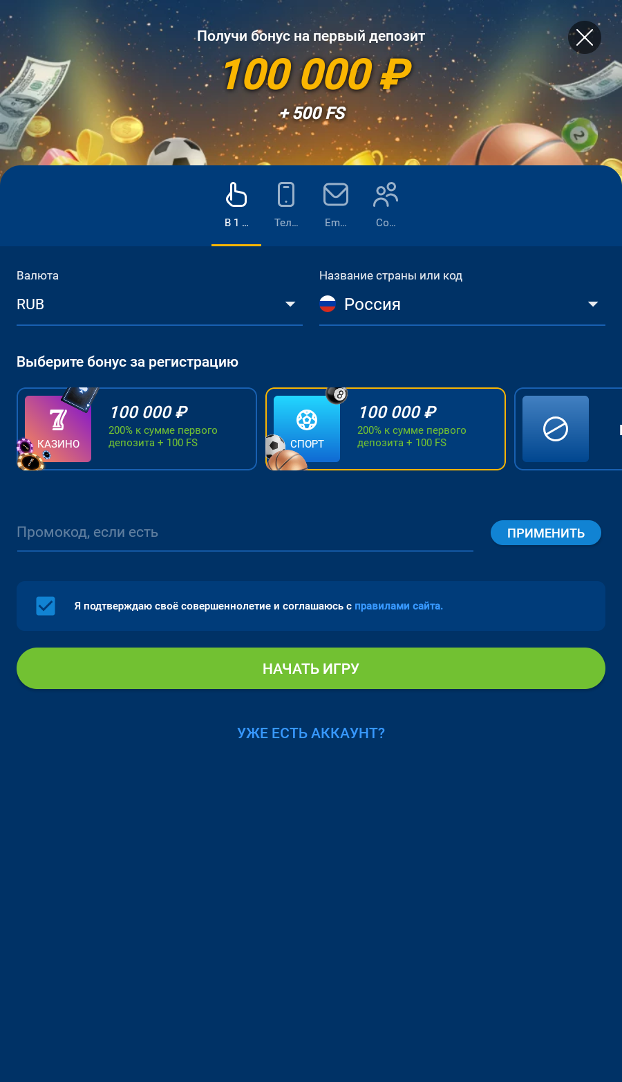 Россия Узбекистан Азербайджан Казахстан Повышенный приветственный бонус 200% бонус на 1-й депозит: до 200,000 ₽ и 100 FS при пополнении от 1,500 ₽ в первые 30 минут после регистрации. Или 200% бонус до 50,000 ₽ при пополнении от 500 ₽ за тот же срок. 125% бонус на 2-й депозит и 100 FS при пополнении на 1,500+ ₽, максимум - 200,000 ₽. 75% бонус на 3-й депозит и 100 FS при пополнении на 1,500+ ₽, максимум - 200,000 ₽. 50% бонус на 4-й депозит и 100 FS при пополнении на 1,500+ ₽, максимум - 200,000 ₽. 25% бонус на 5-й депозит и 100 FS при пополнении на 1,500+ ₽, максимум - 200,000 ₽. 200% бонус на 1-й депозит: до 10,000,000 UZS и 100 FS при пополнении от 50,000 UZS в первые 30 минут после регистрации. Или 200% бонус до 2,500,000 UZS при пополнении от 15,000 UZS за тот же срок. 125% бонус на 2-й депозит и 100 FS при пополнении на 50,000 UZS, максимум - 10,000,000 UZS. 75% бонус на 3-й депозит и 100 FS при пополнении на 50,000 UZS, максимум - 10,000,000 UZS. 50% бонус на 4-й депозит и 100 FS при пополнении на 50,000 UZS, максимум - 10,000,000 UZS. 25% бонус на 5-й депозит и 100 FS при пополнении на 50,000 UZS, максимум - 10,000,000 UZS. 200% бонус на 1-й депозит: до 10,000 AZN и 100 FS при пополнении от 15 AZN в первые 30 минут после регистрации.Или 200% бонус до 1,000 AZN при пополнении от 5 AZN за тот же срок. 125% бонус на 2-й депозит и 100 FS при пополнении на 15+ AZN, максимум - 10,000 AZN. 100% бонус на 3-й депозит и 100 FS при пополнении на 15+ AZN, максимум - 10,000 AZN. 75% бонус на 4-й депозит и 100 FS при пополнении на 15+ AZN, максимум - 10,000 AZN. 25% бонус на 5-й депозит и 100 FS при пополнении на 15+ AZN, максимум - 10,000 AZN. 200% бонус на 1-й депозит: до 3,000,000 тенге и 250 FS при пополнении от 2,000 тенге в первые 30 минут после регистрации. Или 200% бонус до 1,500,000 тенге при пополнении от 600 тенге за тот же срок. 75% бонус на 2-й депозит и 100 FS при пополнении на 2,000+ тенге, максимум - 500,000 тенге. 100% бонус на 3-й депозит и 75 FS при пополнении на 2,000+ тенге, максимум - 500,000 тенге. 125% бонус на 4-й депозит и 75 FS при пополнении на 2,000+ тенге, максимум - 500,000 тенге. 150% бонус на 5-й депозит и 50 FS при пополнении на 2,000+ тенге, максимум - 500,000 тенге. Стандартный приветственный бонус 100% бонус до 200,000 ₽ и 100 FS за 1-й депозит от 1,500 ₽ в первые 7 дней после регистрации. Или 100% бонус до 50,000 ₽ при пополнении от 500 ₽ за тот же срок. 125% бонус на 2-й депозит при пополнении на 500+ ₽, максимум - 50,000 ₽ 75% бонус на 3-й депозит при пополнении на 500+ ₽, максимум - 50,000 ₽. 50% бонус на 4-й депозит при пополнении на 500+ ₽, максимум - 50,000 ₽. 25% бонус на 5-й депозит при пополнении на 500+ ₽, максимум - 50,000 ₽. 100% бонус до 10,000,000 UZS и 100 FS за 1-й депозит от 50,000 UZS в первые 7 дней после регистрации. Или 100% бонус до 2,500,000 UZS при пополнении от 15,000 UZS за тот же срок. 125% бонус на 2-й депозит при пополнении на 15,000+ UZS, максимум - 2,500,000 UZS 75% бонус на 3-й депозит при пополнении на 15,000 UZS, максимум - 2,500,000 UZS. 50% бонус на 4-й депозит при пополнении на 15,000 UZS, максимум - 2,500,000 UZS. 25% бонус на 5-й депозит при пополнении на 15,000 UZS, максимум - 2,500,000 UZS. 125% бонус до 10,000 AZN и 100 FS за 1-й депозит от 15 AZN в первые 7 дней после регистрации. Или 100% бонус до 1,000 AZN при пополнении от 5 AZN за тот же срок. 125% бонус на 2-й депозит при пополнении на 5+ AZN, максимум - 1,000 AZN 100% бонус на 3-й депозит при пополнении на 5+ AZN, максимум - 1,000 AZN. 75% бонус на 4-й депозит при пополнении на 5+ AZN, максимум - 1,000 AZN. 25% бонус на 5-й депозит при пополнении на 5+ AZN, максимум - 1,000 AZN. 100% бонус до 3,000,000 тенге и 250 FS за 1-й депозит от 2,000 тенге в первые 7 дней после регистрации. Или 100% бонус до 1,500,000 тенге при пополнении от 600 тенге за тот же срок. 75% бонус на 2-й депозит при пополнении на 600+ тенге, максимум - 300,000 т