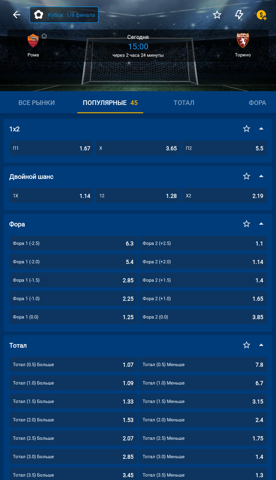 - до 1000 рынков на один футбольный матч, включая: